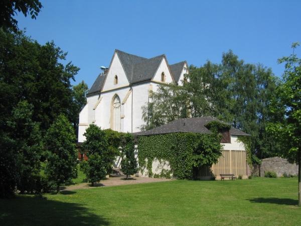 Vorne ist die Sakristei, rechts sieht man noch ein Stück Burgmauer