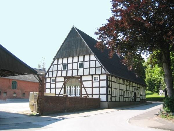 Die hohen Gebäude im Hintergrund sind Teil der ehemaligen Ackerbauschule, eine Stiftung der Fam. Hüffer.